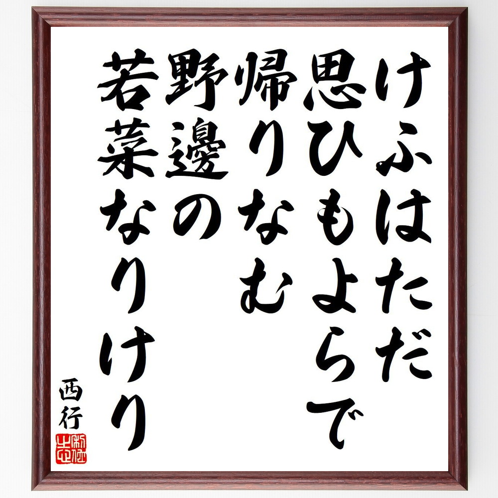 西行の名言「けふはただ、思ひもよらで、帰りなむ、野邊の若菜なりけり」を、千言堂の専属書道家が気持ちを込めて手書き直筆いたします。この言葉(ひとこと)は名言集や本・書籍などで紹介されることも多く、座右の銘にされている方も多いようです。ぜひ、ご自宅の玄関、リビング、部屋、書斎、またビジネスを営む会社のオフィスや店舗の事務所、応接室などにお飾りください。大切な方への贈り物・プレゼントにもおすすめです。一点一点が直筆のため、パソコン制作のような完璧さはございませんが、手書きの良さを感じていただけます。当店では挑戦、努力、成功、幸福、感謝、成長、家族、仕事、自己啓発など様々なテーマから人生の糧となる名言、四字熟語、諺、故事成語、格言を厳選、毛筆で直筆、お届けしています。