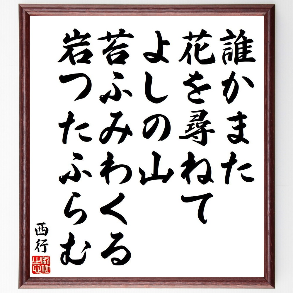 西行の短歌・俳句「誰かまた、花を尋ねて、よしの山、苔ふみわくる、岩つたふらむ」を、千言堂の専属書道家が気持ちを込めて手書き直筆いたします。この言葉(ひとこと)は名言集や本・書籍などで紹介されることも多く、座右の銘にされている方も多いようです。ぜひ、ご自宅の玄関、リビング、部屋、書斎、またビジネスを営む会社のオフィスや店舗の事務所、応接室などにお飾りください。大切な方への贈り物・プレゼントにもおすすめです。一点一点が直筆のため、パソコン制作のような完璧さはございませんが、手書きの良さを感じていただけます。当店では挑戦、努力、成功、幸福、感謝、成長、家族、仕事、自己啓発など様々なテーマから人生の糧となる名言、四字熟語、諺、故事成語、格言を厳選、毛筆で直筆、お届けしています。