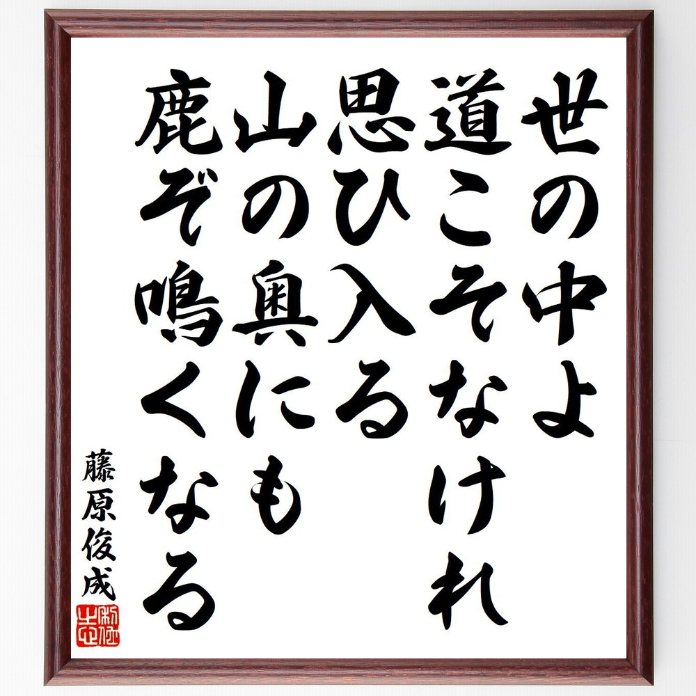 藤原俊成の短歌・俳句「世の中よ、道こそなけれ、思ひ入る、山の奥にも、鹿ぞ鳴くなる」手書き書道色紙額/受注後の毛筆直筆