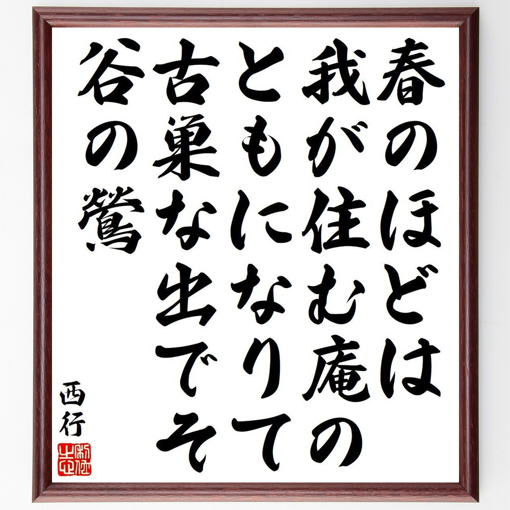 西行の名言「春のほどは、我が住む庵の、ともになりて、古巣な出でそ、谷の鶯」を、千言堂の専属書道家が気持ちを込めて手書き直筆いたします。この言葉(ひとこと)は名言集や本・書籍などで紹介されることも多く、座右の銘にされている方も多いようです。ぜひ、ご自宅の玄関、リビング、部屋、書斎、またビジネスを営む会社のオフィスや店舗の事務所、応接室などにお飾りください。大切な方への贈り物・プレゼントにもおすすめです。一点一点が直筆のため、パソコン制作のような完璧さはございませんが、手書きの良さを感じていただけます。当店では挑戦、努力、成功、幸福、感謝、成長、家族、仕事、自己啓発など様々なテーマから人生の糧となる名言、四字熟語、諺、故事成語、格言を厳選、毛筆で直筆、お届けしています。