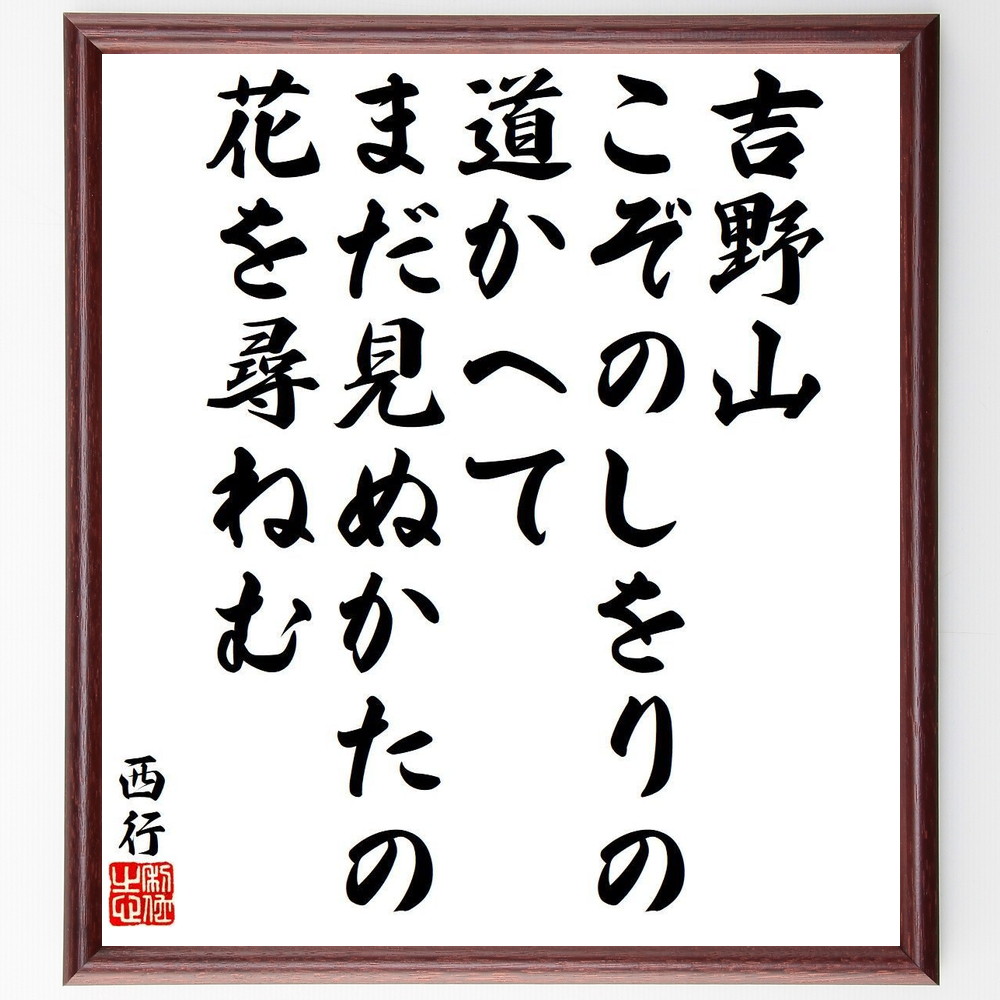西行の短歌・俳句「吉野山、こぞのしをりの、道かへて、まだ見ぬかたの、花を尋ねむ」を、千言堂の専属書道家が気持ちを込めて手書き直筆いたします。この言葉(ひとこと)は名言集や本・書籍などで紹介されることも多く、座右の銘にされている方も多いようです。ぜひ、ご自宅の玄関、リビング、部屋、書斎、またビジネスを営む会社のオフィスや店舗の事務所、応接室などにお飾りください。大切な方への贈り物・プレゼントにもおすすめです。一点一点が直筆のため、パソコン制作のような完璧さはございませんが、手書きの良さを感じていただけます。当店では挑戦、努力、成功、幸福、感謝、成長、家族、仕事、自己啓発など様々なテーマから人生の糧となる名言、四字熟語、諺、故事成語、格言を厳選、毛筆で直筆、お届けしています。