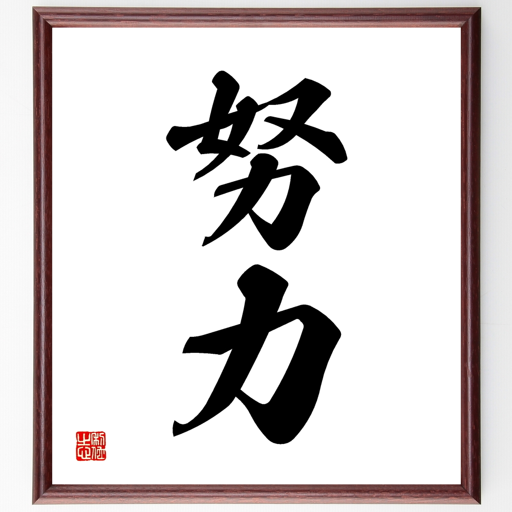 二字熟語「努力」を、千言堂の専属書道家が気持ちを込めて手書き直筆いたします。この言葉(ひとこと)は名言集や本・書籍などで紹介されることも多く、座右の銘にされている方も多いようです。ぜひ、ご自宅の玄関、リビング、部屋、書斎、またビジネスを営む会社のオフィスや店舗の事務所、応接室などにお飾りください。大切な方への贈り物・プレゼントにもおすすめです。一点一点が直筆のため、パソコン制作のような完璧さはございませんが、手書きの良さを感じていただけます。当店では挑戦、努力、成功、幸福、感謝、成長、家族、仕事、自己啓発など様々なテーマから人生の糧となる名言、四字熟語、諺、故事成語、格言を厳選、毛筆で直筆、お届けしています。