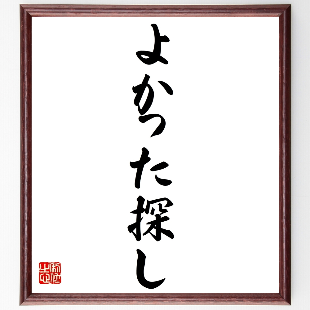 名言「よかった探し」を、千言堂の専属書道家が気持ちを込めて手書き直筆いたします。この言葉(ひとこと)は名言集や本・書籍などで紹介されることも多く、座右の銘にされている方も多いようです。ぜひ、ご自宅の玄関、リビング、部屋、書斎、またビジネスを営む会社のオフィスや店舗の事務所、応接室などにお飾りください。大切な方への贈り物・プレゼントにもおすすめです。一点一点が直筆のため、パソコン制作のような完璧さはございませんが、手書きの良さを感じていただけます。当店では挑戦、努力、成功、幸福、感謝、成長、家族、仕事、自己啓発など様々なテーマから人生の糧となる名言、四字熟語、諺、故事成語、格言を厳選、毛筆で直筆、お届けしています。