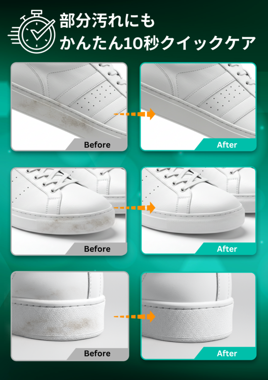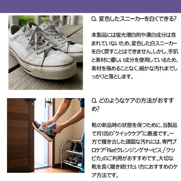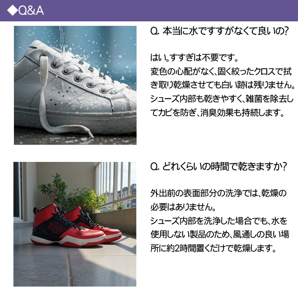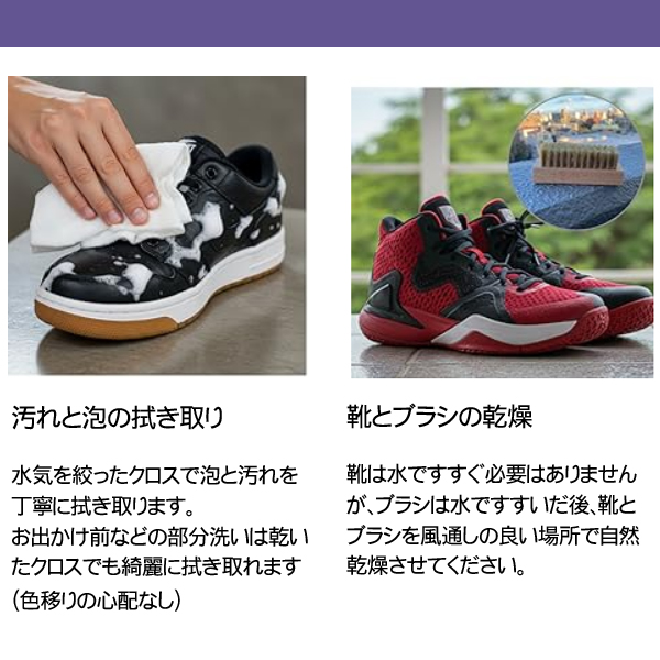 ・水不要の泡タイプでかんたんケア。新品の輝きと清潔な履き心地をキープ。
