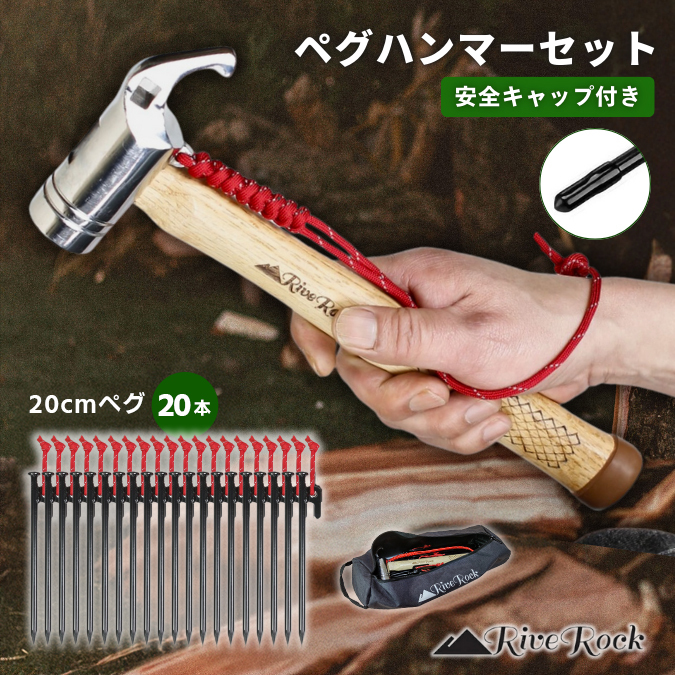 RiveRock (リバロック) ペグハンマー スチールペグ 20本 セット 収納袋 夜光ロープ 強靭 テント設営 タープ設営 ペグ