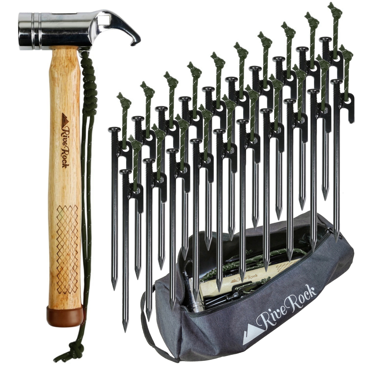 RiveRock (リバロック) ペグハンマー スチールペグ 20本 セット 緑 収納袋 夜光ロープ 強靭 テント設営 タープ設営 ペグ