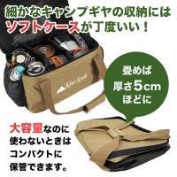 大容量のコンテナボックスです。サイズー横幅41cm奥行27cm高さ21cm。丁度よいサイズ感でペグや手斧はもちろん焚き火台、調理具、クッカー、カセットガス、OD缶、CB缶など様々なギアを収納できます。ベルクロで調整可能な仕切板で多彩なアレンジができ、仕切板を外せば大きなギアも収納出来ます。ソフトケースですので大切なギアの保護になります。