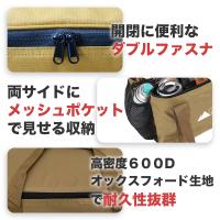 蓋裏に大面のメッシュポケットがあります。無くしがちな小物の収納に便利です。外面両サイドにも大きなメッシュポケットがあり、見せる収納が可能です。