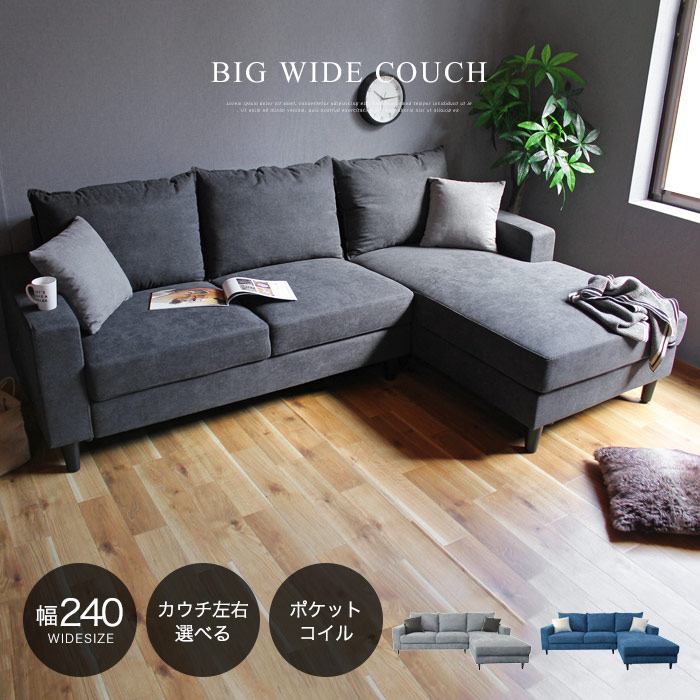 カウチソファ コーナーソファ 3人掛け ポケットコイル ネイビー L字ソファ リビングソファ 幅240cm おしゃれ 北欧 シンプル (選べる開梱設置サービス)