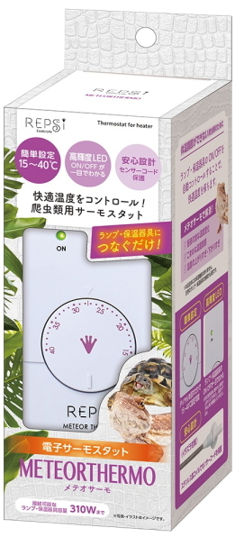快適温度をコントロール!爬虫類用サーモスタット。簡単設定:ダイヤルを回すだけで15〜40℃設定可能。高輝度LED:ランプ・保温器具のON/OFFが一目でわかる。安心設計:ステンレス製コイルでセンサーコードを保護。規格: 接続可能なランプ・保温器具容量:合計310Wまで、制御温度範囲:15〜40℃(精度±1℃)、安全装置:ヒューズ、電源コード:1.5m、センサーコード:1m(保護コイル:100mm)、コンセントコード:0.2m