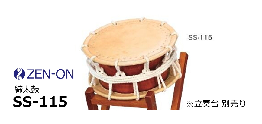 ゼンオン 締太鼓 SS-115■並附軽量で音質が良く、台にも傷がつかない締太鼓です。・ロープ締・胴:目有材・皮:牛本革・寸法:口径 1尺1寸5分(35cm) x 高さ 15cm・重量:3.4kg・付属品:バチ