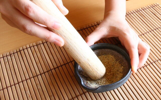 1.すり鉢とすりこぎを水につけ、湿った状態にします。 2. すりこぎがすり面全体に当たるよう右回り・左回りにゴリゴリ擂ります。 3.櫛目と櫛目の間に出来ている、櫛目の合わせの弱い部分がとれましたら終了です。 |