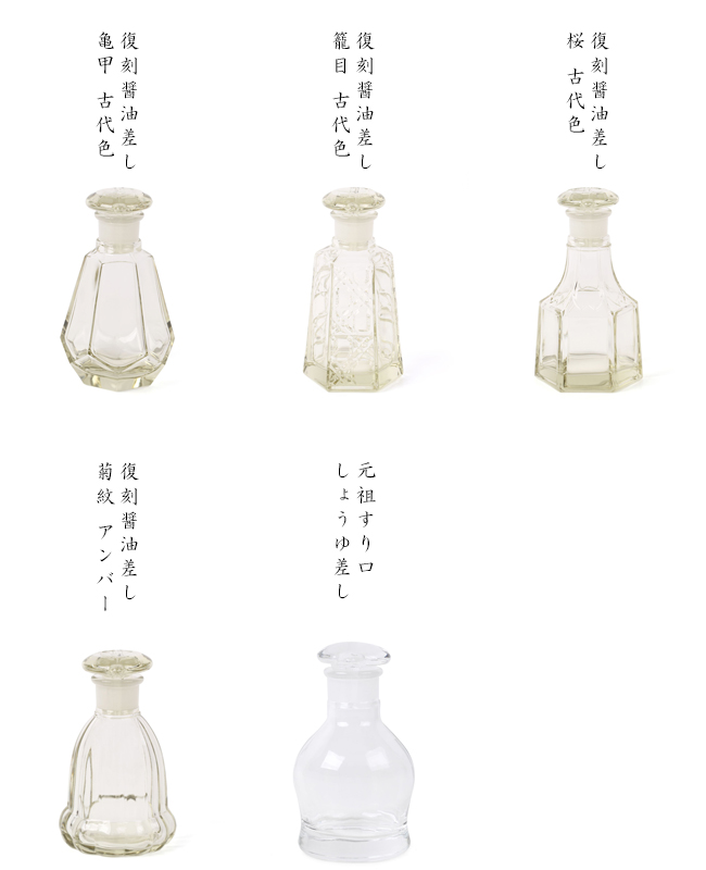 | サイズ | <亀甲> 6.5cm×11cm 140ml <籠目> 6.5cm×11.5cm 130ml <桜> 6.5cm×11.5cm 100ml <菊紋> 6.5cm×11cm 120ml <元祖すり口醤油差し> 6.5cm×11cm 120ml |