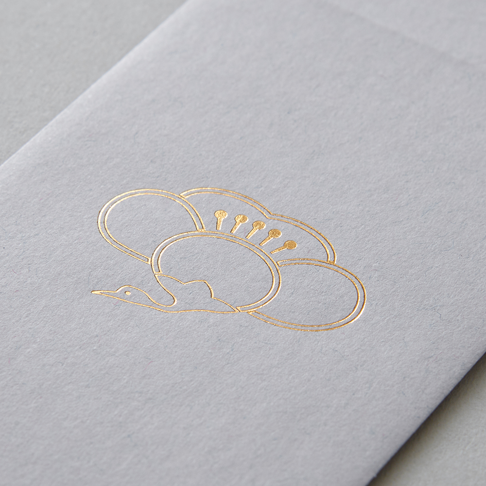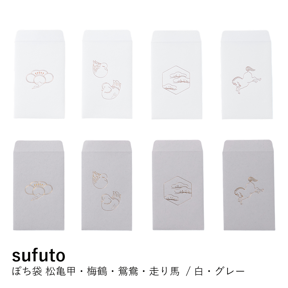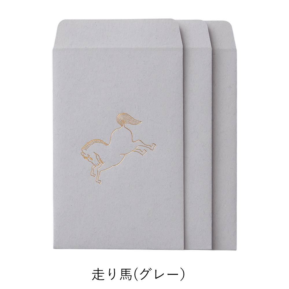 | 縁起のよい布をつくってきた、織物屋ならではのぽち袋。 工房にストックされてきた吉祥柄や家紋の下絵がモチーフになっています。 西陣織の繊細な金箔の糸をイメージした箔押しで美しく仕上げました。 シーンを選ばず、ハレとケのどちらにもお使いいただけます。 <梅鶴>縁起のよい梅と鶴を合わせて意味合いを重ねる「見立て紋」という手法でつくられた家紋です。 <鴛鴦>いつも仲良く寄り添うおしどりの夫婦は、縁起のよい鳥として古くから親しまれています。 <松亀甲>松は常に緑の葉をつけていることから、不老長寿の象徴とされてきました。亀の甲羅を図案化した亀甲もまた不老長寿の縁起物です。 <走り馬>馬の家紋のひとつ。神様の乗る生き物として神社に奉納されていた名残が現在の絵馬です。戦国時代には勝利の象徴にもされていました。 |