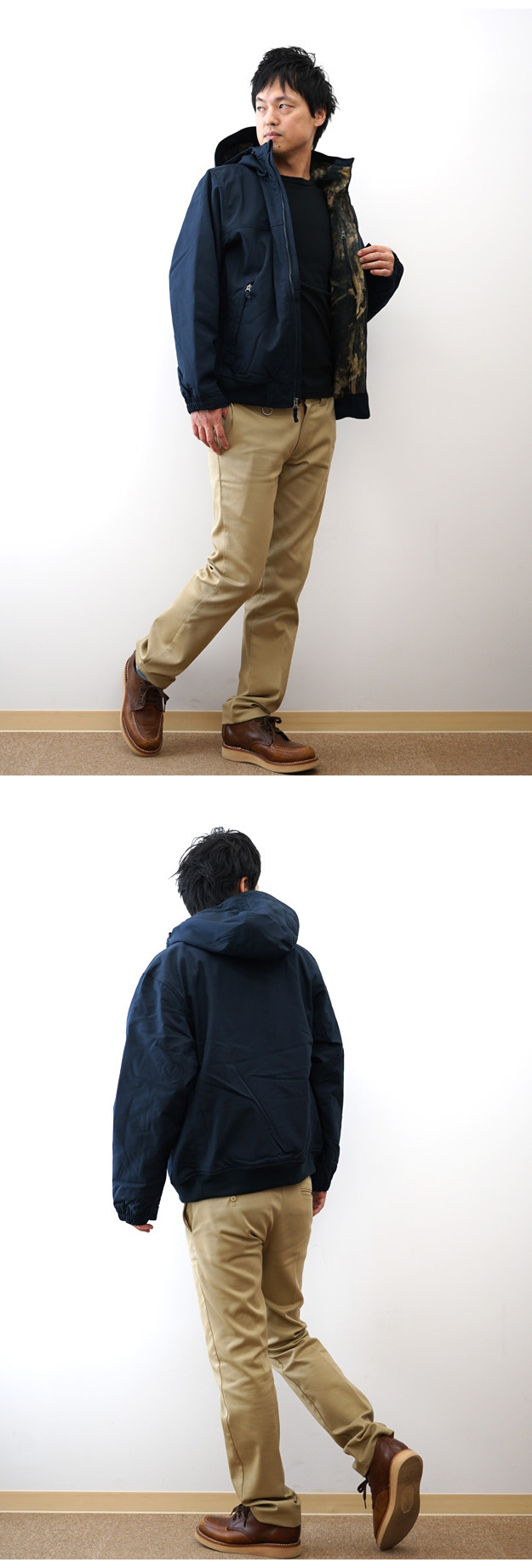 【特徴一覧】・表地:T/Cキャンバス素材・裏地:保温力のあるフリース素材・中綿:ポリエステル素材・フード付き・肩周りの可動域を広げる立体裁断・小物収納やハンドフォーマーに役立つ両サイドのファスナーポケット・アウトドアから街着にフィット・XSサイズ展開あり・フード内部に遊び心のあるオリジナルカモ柄デザイン(031カラー Cirrus Grey)、(439カラー Abysse)展開あり