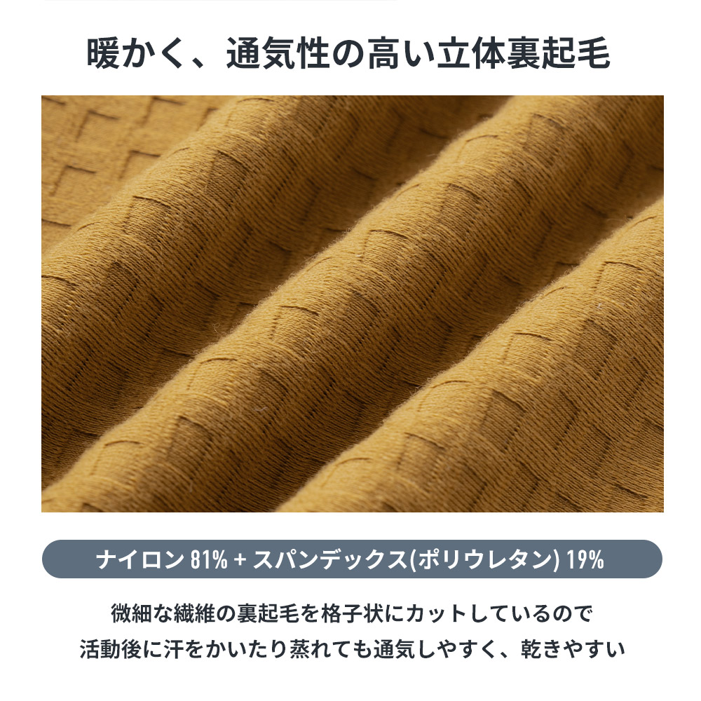 ・3D立体裏起毛:内側を格子状にカットすることで、保温性と通気性をバランスよく両立させています