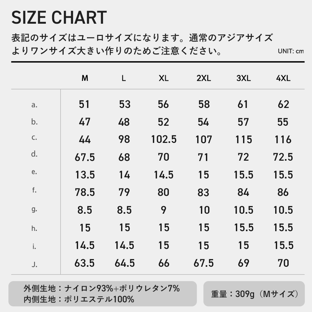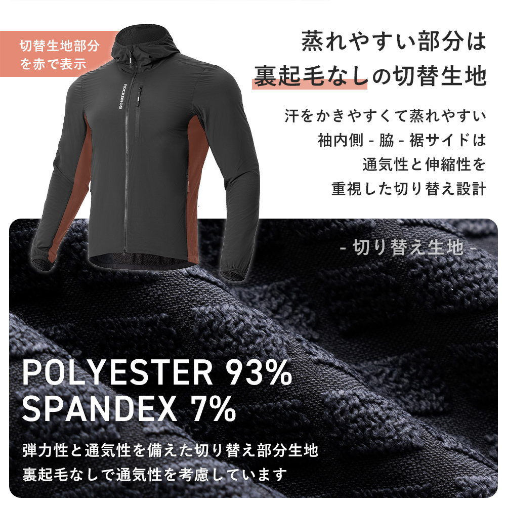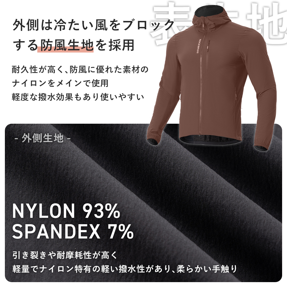 ・外側生地機能:防風、耐引裂性、耐摩耗性、軽量、撥水性
