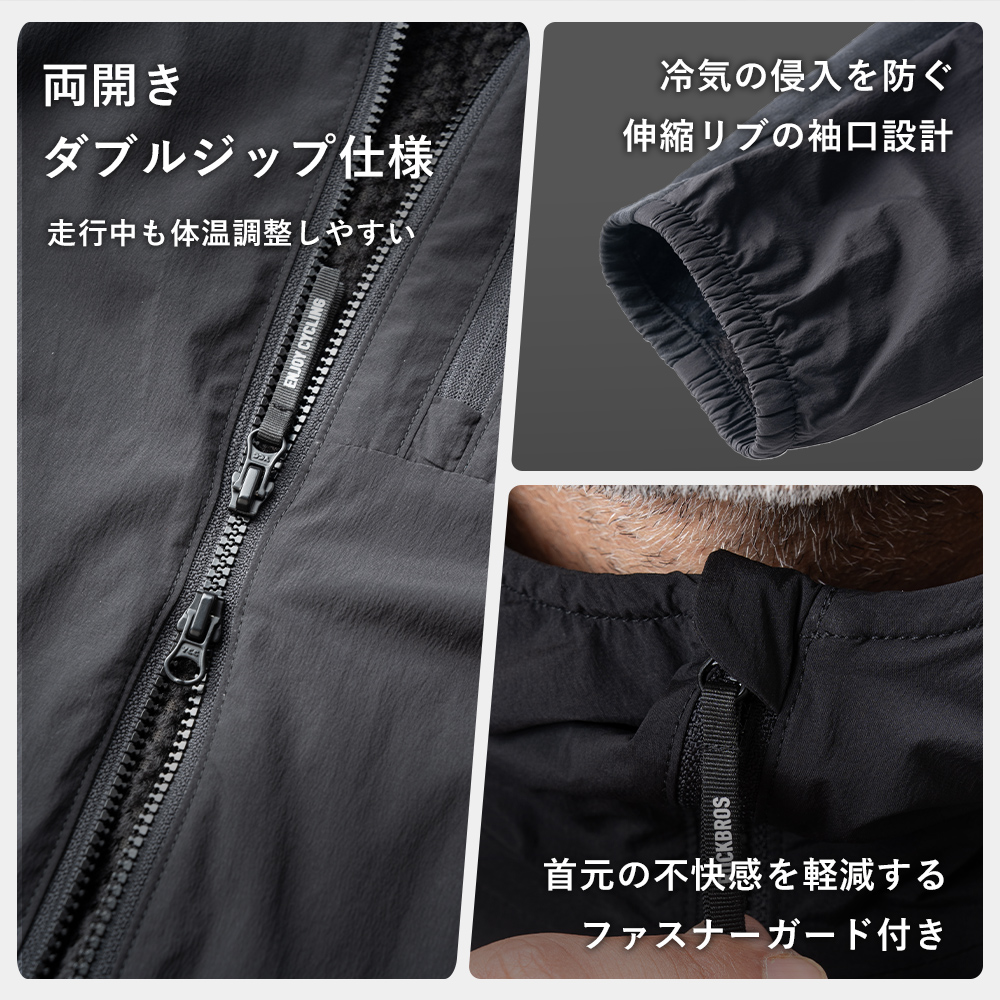 ・袖口:風の侵入を防ぐ伸縮リブ設計