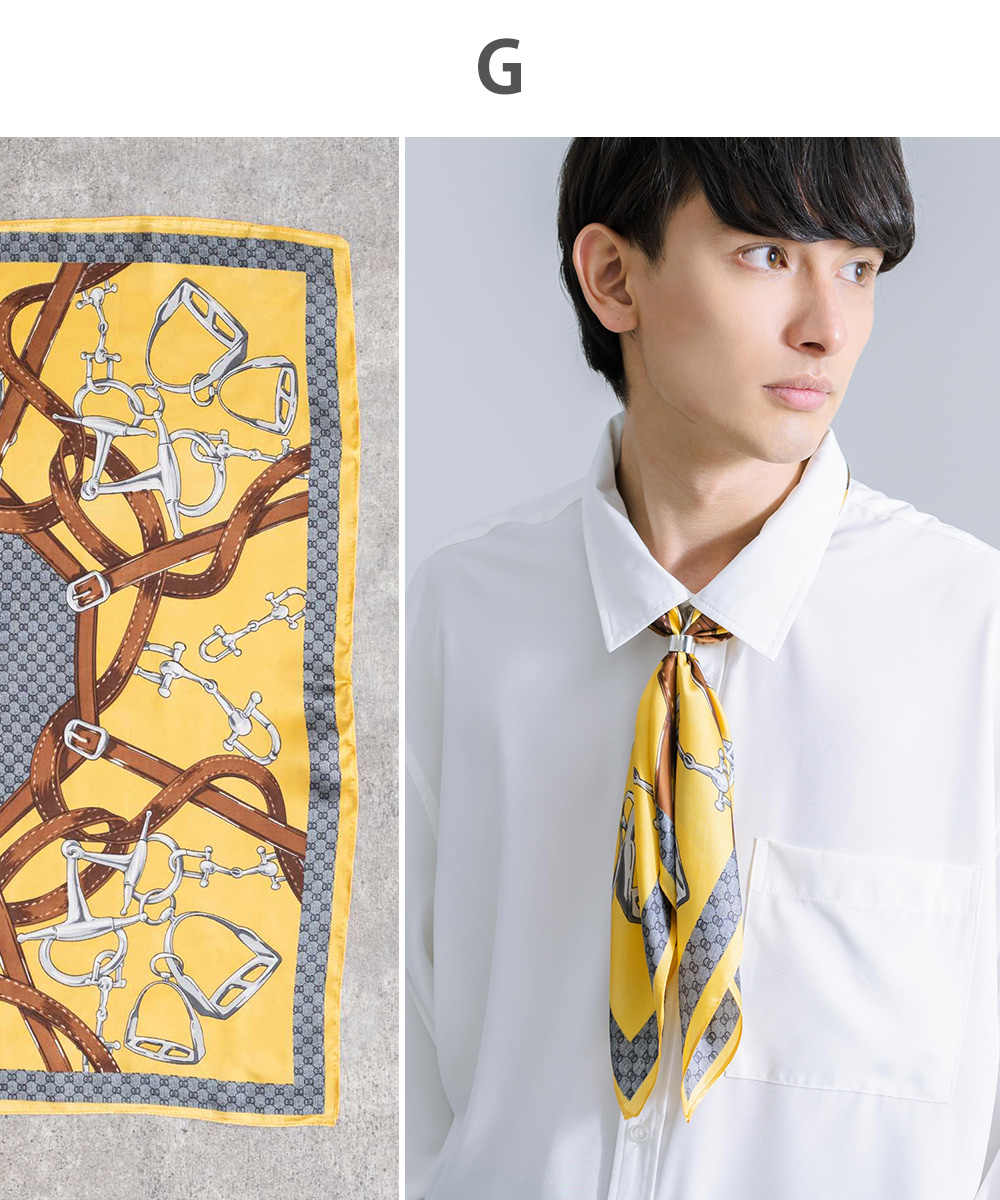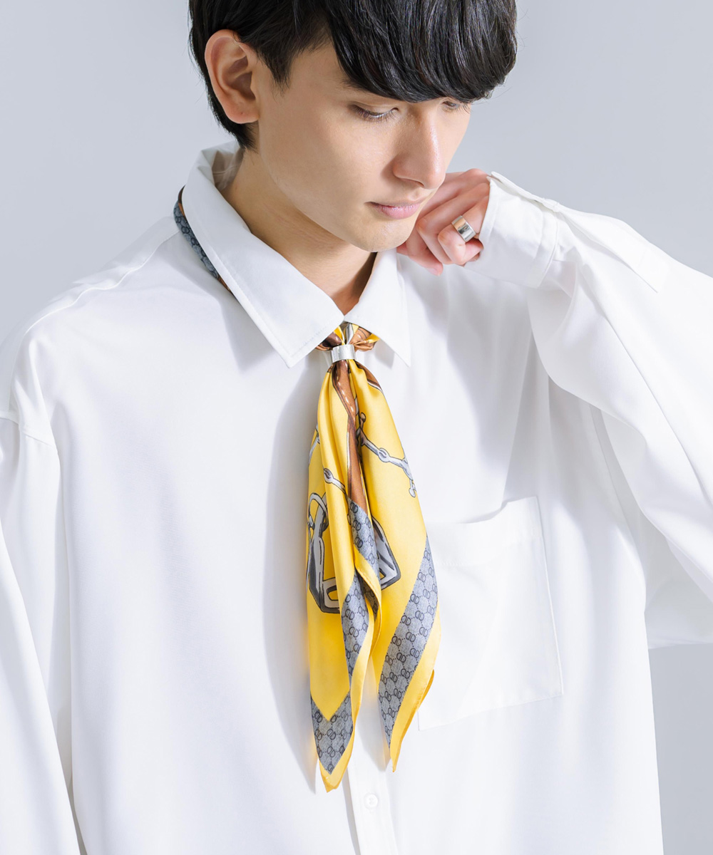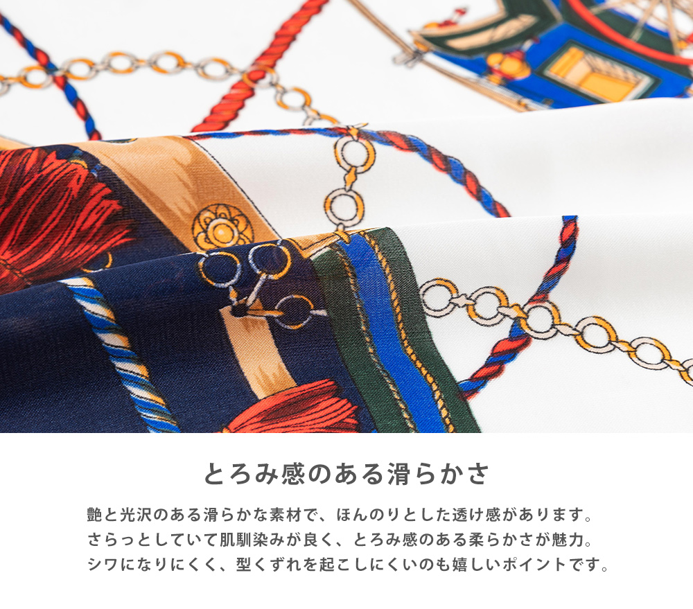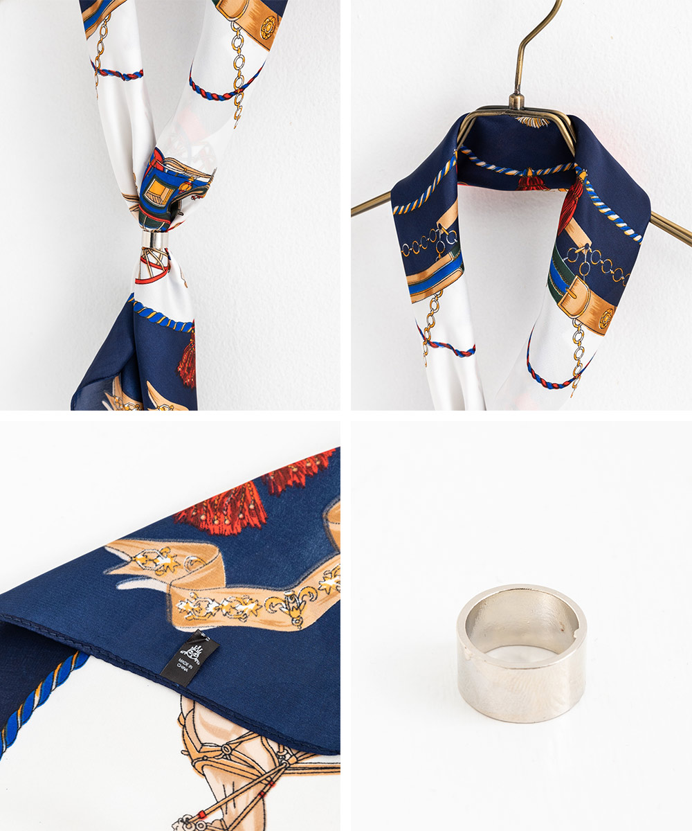 首元を華やかにする大判サイズのスカーフに、スカーフリング付き。