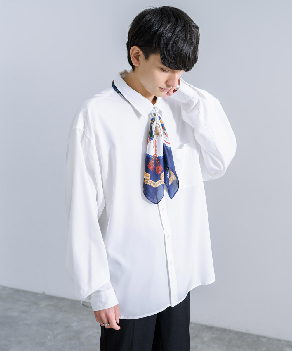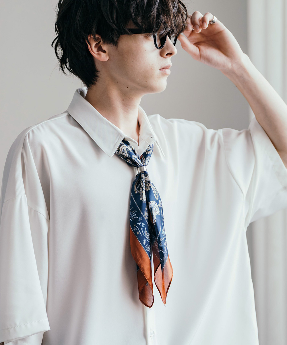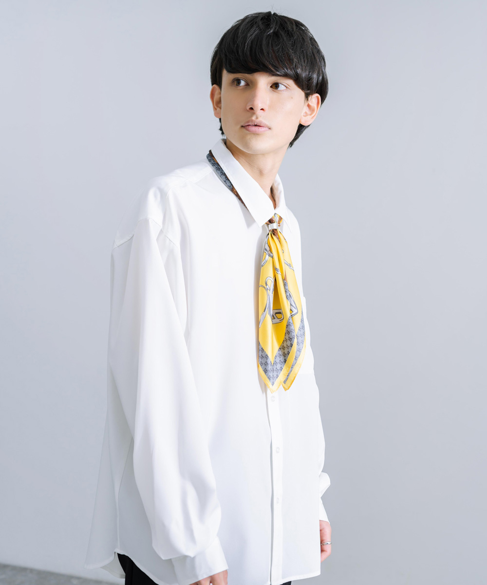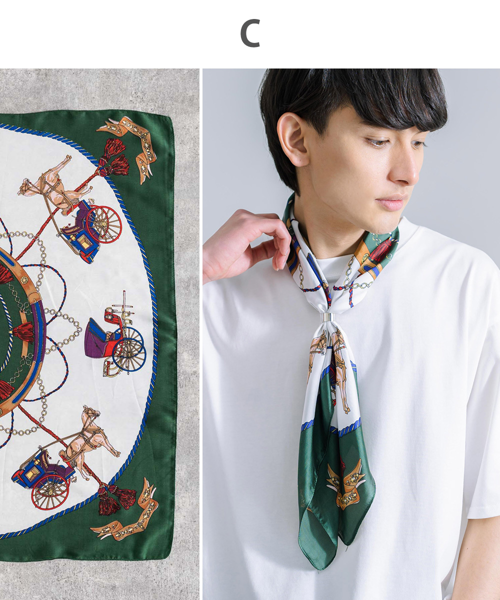 首元を華やかにする大判サイズのスカーフに、スカーフリング付き。