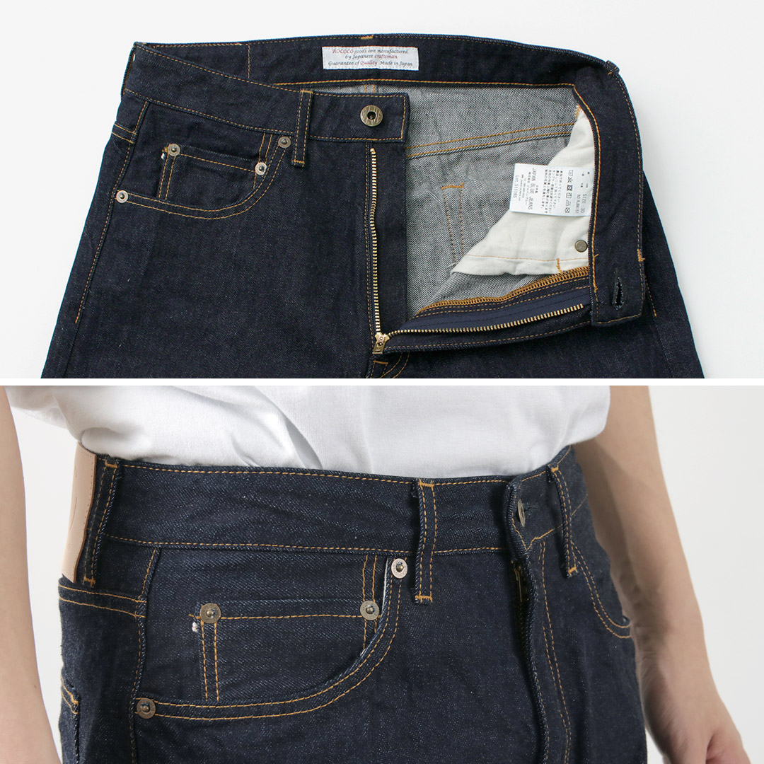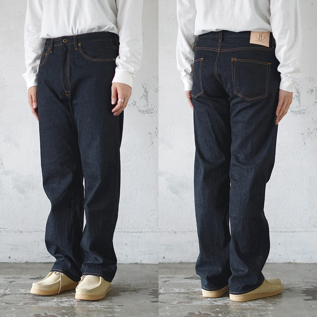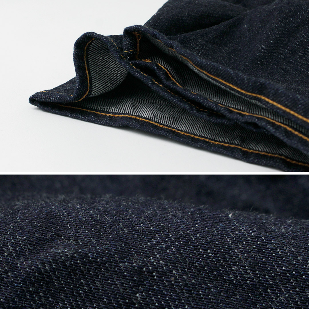 | ●スタッフ(181cm/80kg) 体型:ガッチリ 着用:サイズ34/36 サイズ34でウエスト・ヒップともにほど良く余裕をもって穿けました。丈は長めなので、ジャストレングスで穿きたい場合は丈上げが必要です。サイズ36はややゆとりのある穿き心地です。少しルーズに着用していただき、ロールアップしてセルヴィッチを見せて穿くのもおすすめです。 |