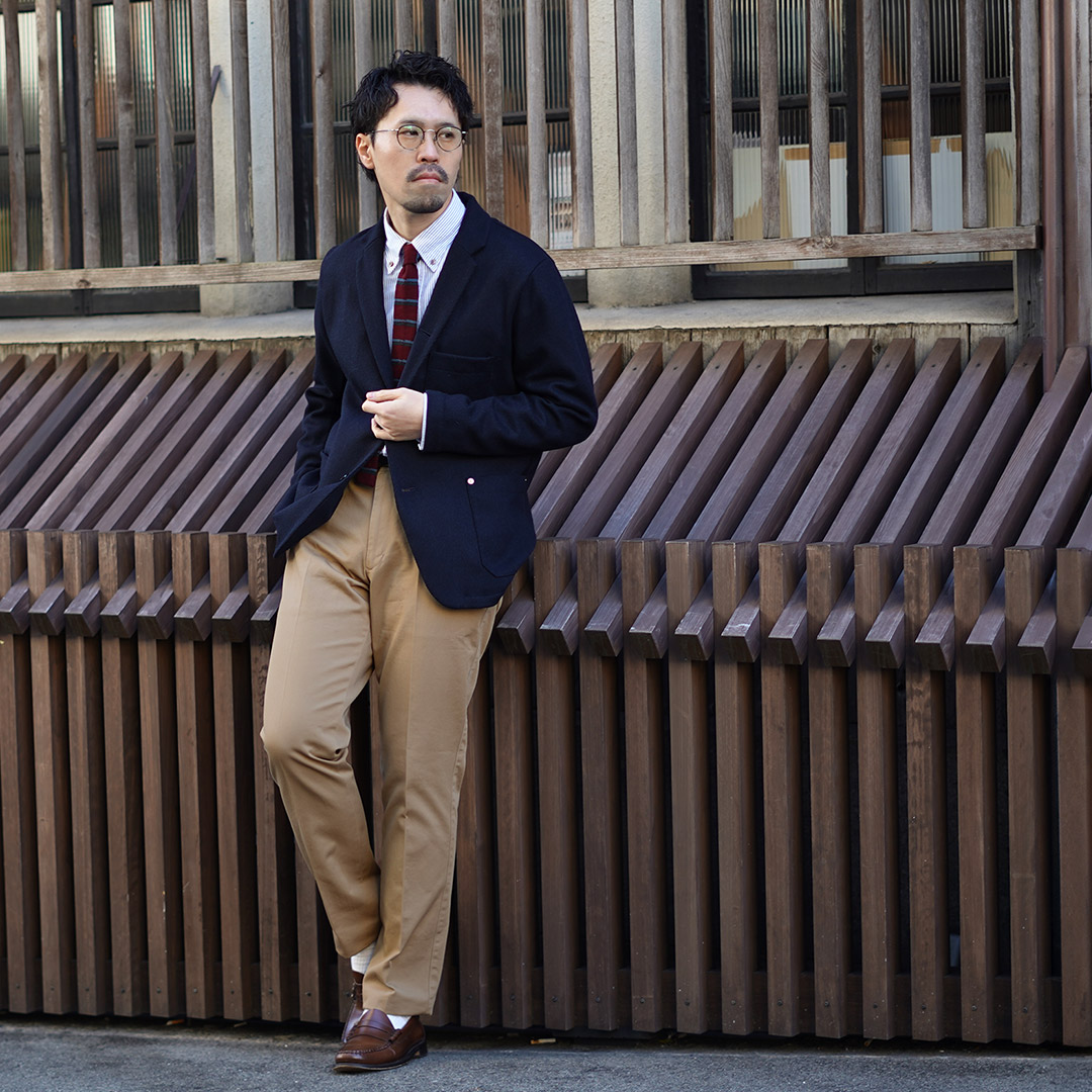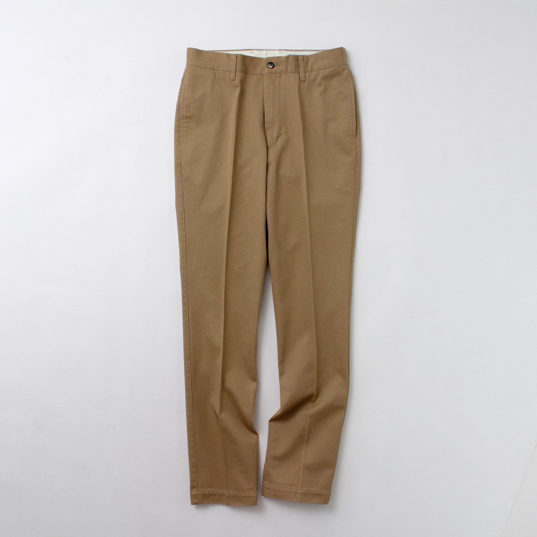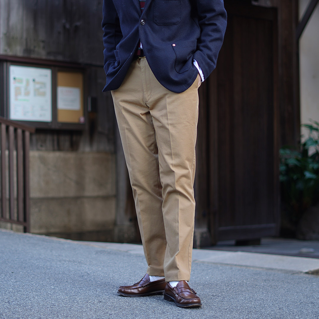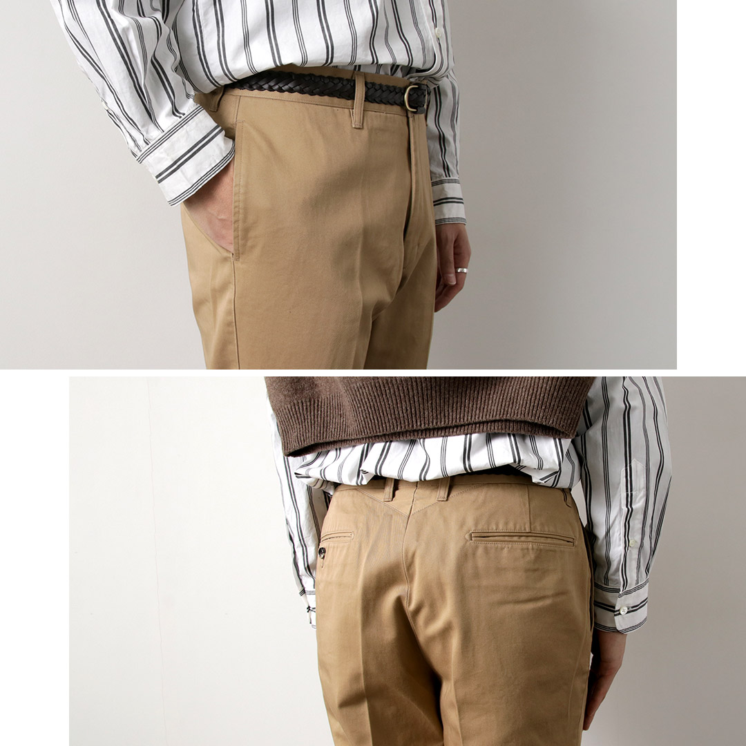 | ●スタッフ(181cm/80kg) 体型:ガッチリ 着用:サイズXL サイズLでも着用できますが、サイズXLのほうがもも周りとヒップにゆとりがあり快適でした。ハリ感のある生地が一般的なチノパンにはない上品さをプラスしています。普段のコーディネートに加えるだけでこなれたスタイリングへと昇華してくれます。 |
