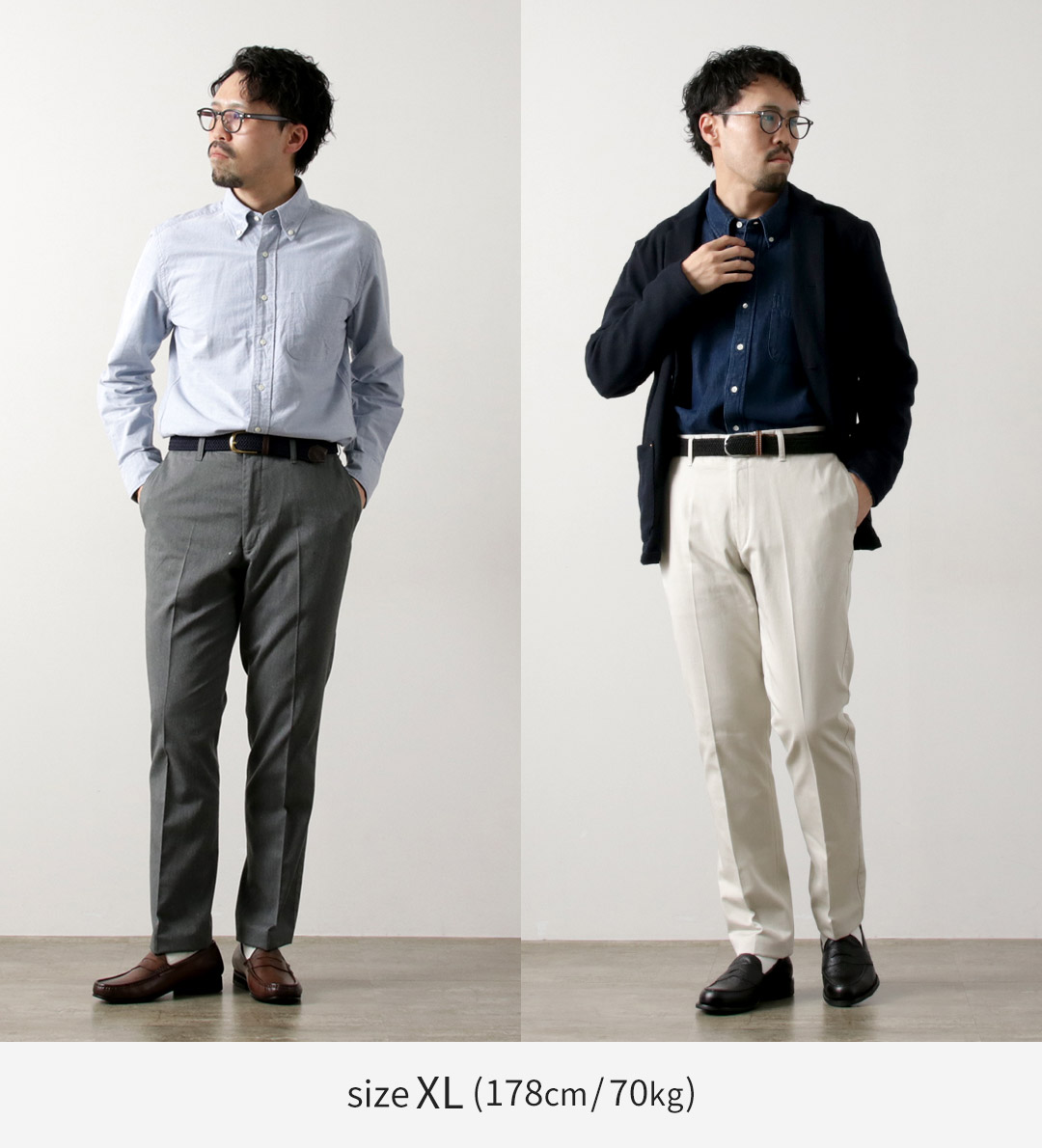 | ●スタッフ(177cm/67kg) 体型:普通 着用:サイズXL XLサイズが丁度良いです。サイズLであっても着用出来ますが、太もも周りやタックインの事を考えると少し小さい印象があります。タックイン+革靴でキレイめな大人スタイルを叶えてくれます。 |