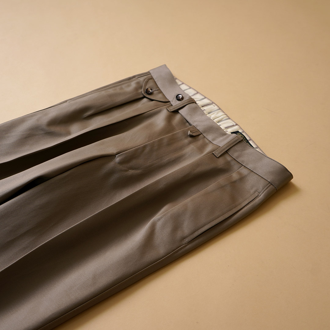 | ●スタッフ(171cm/61kg) 体型:普通 着用:サイズM ウエストはサイズMでベルトなしでばっちりのサイズ感。腰周りはフィット感がありながらもヒップやもも周りはゆとりがありストレスのない穿き心地です。独特な生地の光沢がとても品よく、トラッドなスタイルにピッタリだと思います。 |