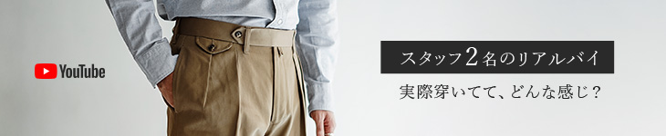 | ●スタッフ(181cm/80kg) 体型:ガッチリ 着用:サイズXL サイズLでも着用できますが、サイズXLのほうがもも周りとヒップにゆとりがあり快適でした。ハリ感のある生地が一般的なチノパンにはない上品さをプラスしています。普段のコーディネートに加えるだけでこなれたスタイリングへと昇華してくれます。 |