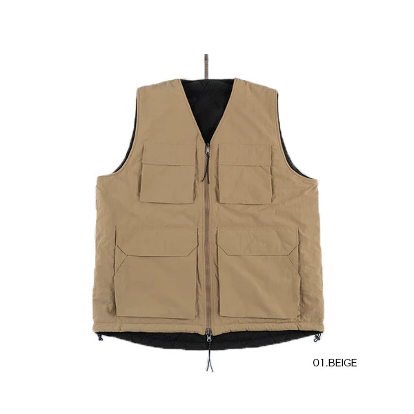 ナイロン素材を使用した表面とフリース素材にダイヤ柄のキルティングが施された裏側の印象が異なるリバーシブル仕様。