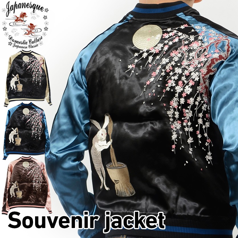 | Moon Cherry Blossoms Rabit Rice cake making Embroidered Reversible Souvenir Jacket 月 桜 兎 餅つき 刺繍 リバーシブル スーベニア ジャケット リバーシブル面は無地のマッドなジャケットとなっておりますので コーディネートの幅が広がる一品です。 このスカジャンは表地はレーヨン、裏地はポリエステルで作られております。 スカジャンといえば両面レーヨンで作成されているものが多いですが 他のスカジャンより安価に作れるので初めて購入される方にも お求めやすい値段設定になっております。 | ||||||||||||||||||||||||||||||