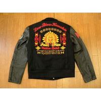 「LOWBLOW KNUCKLE(ローブローナックル)」のスタジャンです。表身頃素材はウール80% ナイロン20%のメルトン生地です。袖はやわらかい豚革レザーです。革にはウォッシュ加工がほどこされています。そのため革はシワ感、アタリがでて、ビンテージ感のある革に仕上がっていますが、いずれも意図的な加工ですので、予めご了承ください。身頃裏地・袖裏地は着易い、すべりの良いポリエステル生地です。身頃裏地にはキルティングがほどこされ、中綿が詰められています(袖には中綿は入っていません)。両袖にはレザーのワッペンが縫い付けられ、左胸、背中にはチェーン刺繍、通常の刺繍、サガラ刺繍がほどこされています。