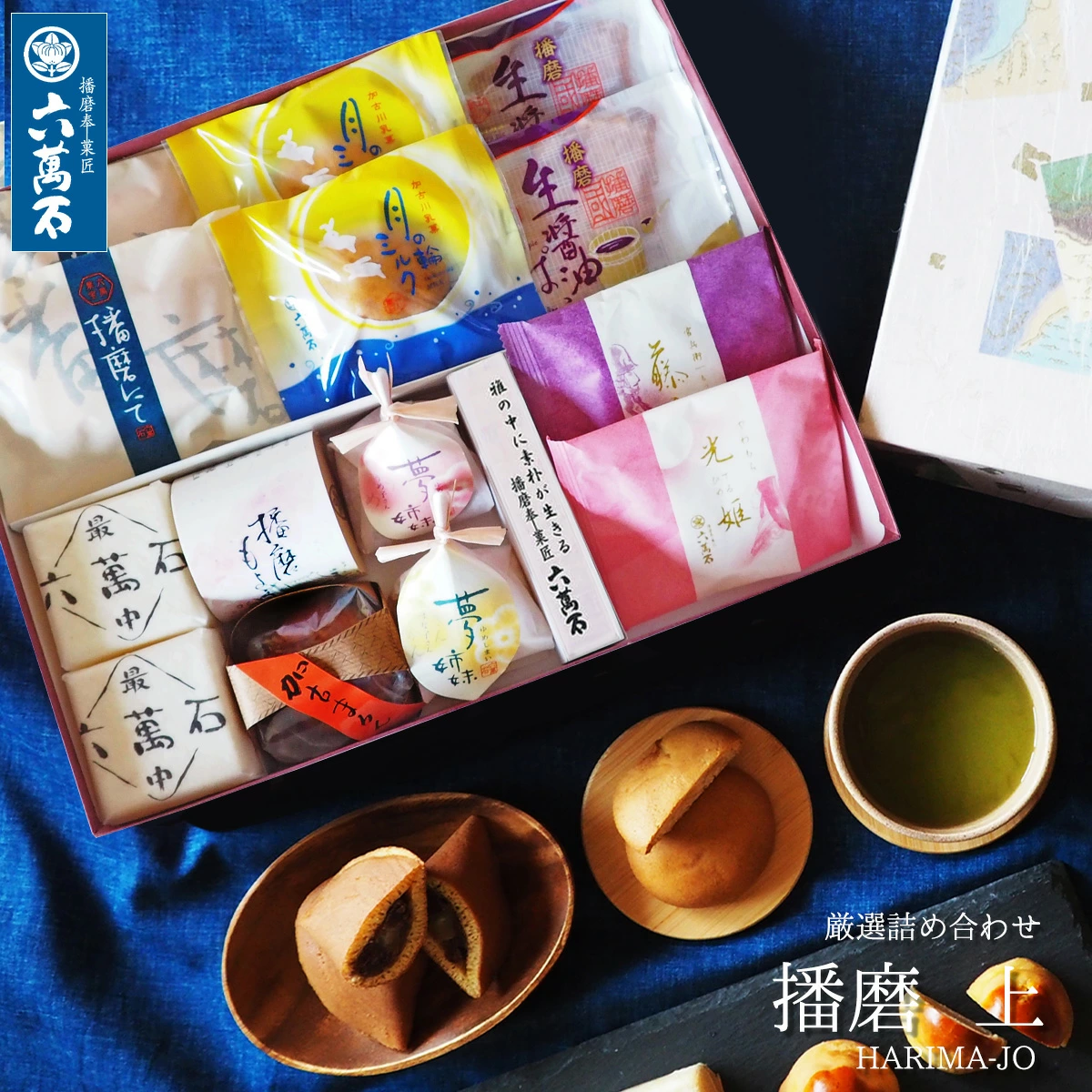 六萬石最中 2個、播磨にて 2個、播磨もよう 1個、加古まろん 1個、月の輪ミルク 2個、生醤油ぱい 2個、夢姉妹(2種) 2個、光姫 1個、藤の花 1個、和三盆糖 3個