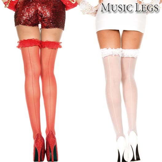 MusicLegs(ミュージックレッグス)レースフリル&バックシーム シアー サイハイストッキング ML4103 ニーハイ オーバーニー 白 赤 薄手 15デニール