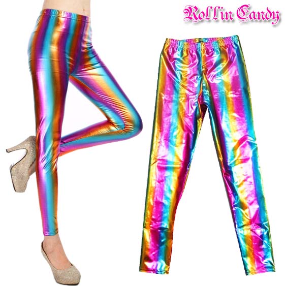 ダンス衣装・ステージ衣装に!レインボー メタリックレギンス スパッツ キラキラ キッズ レディース メタルカラー レギパン 派手 無地 個性的 ヒップホップ 衣裳