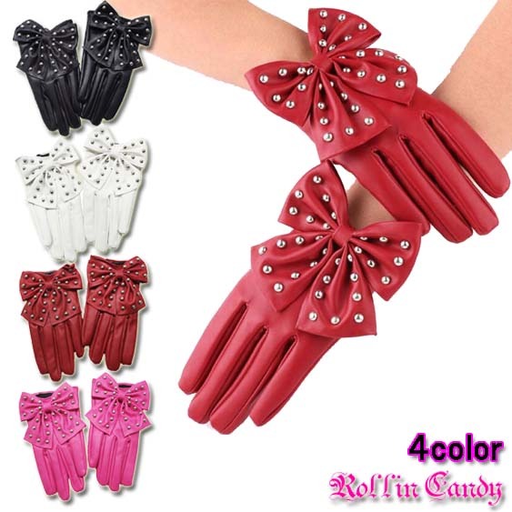 キッズ☆指あり スタッズリボン付き 合皮 ショートグローブ(両手セット) 手袋 ダンス 衣装 バンド ライブ ヒップホップ フェイクレザー レディース