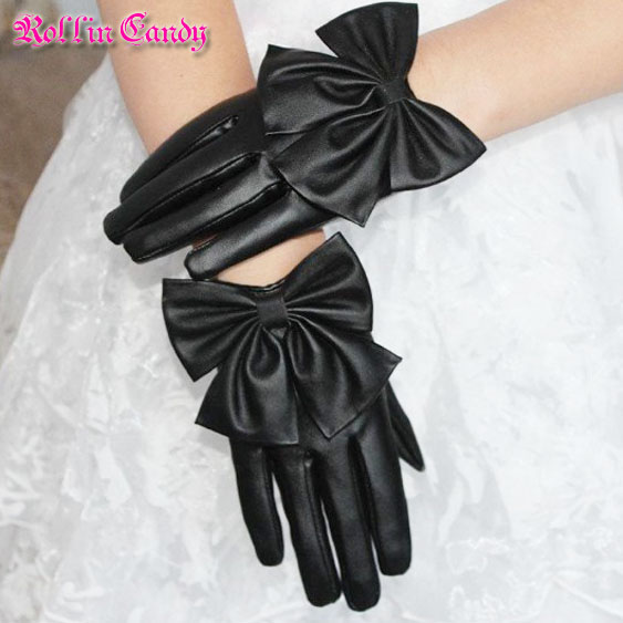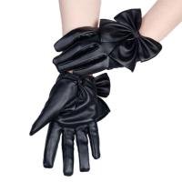 キッズ☆指あり リボン付き 合皮 ショートグローブ(両手セット) 手袋 ブラック 黒 ダンス 衣装 ライブ ショートグローブ フェイクレザー レディース ロリータ