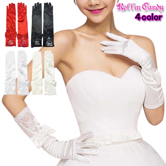 リボン&レース サテンミドルグローブ 手袋 光沢 ストレッチ レディース パーティー ダンス 衣装 カラオケ 社交ダンス 黒 白 赤 ウェディンググローブ 結婚式