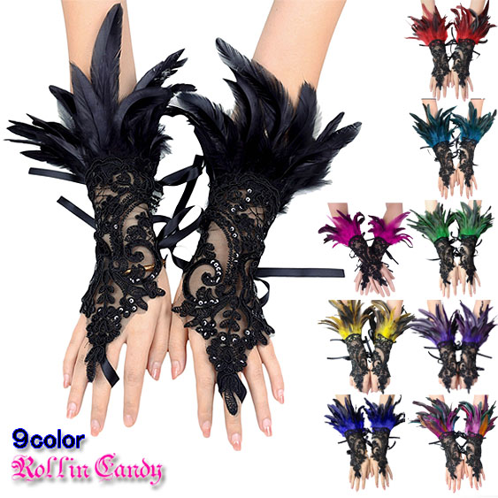 フェザー付き ワンフィンガーグローブ(両手セット) 羽根 刺繍レースグローブ フィンガーレス 手袋 サンバ カーニバル ダンス 衣装 衣裳 レディース