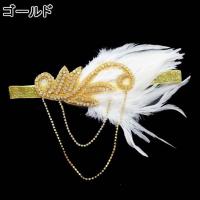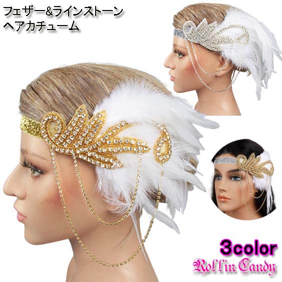 ゴージャス☆白フェザー&ラインストーン ヘアカチューム/ヘアアクセサリー/ヘッドドレス ヘアバンドカチューシャ羽根ゴールドダンス衣装ウェディング
