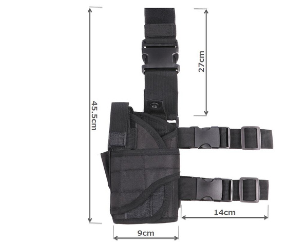 ・男女兼用 ベルクロ 調整式 レッグホルスター【 右足用 ブラック 】 ・内容:レッグホルスター×1点 ・サイズ:収納部分/横9cm 縦18.5cm その他のサイズ/画面を参照 ・材質:ナイロン、プラスチック 重量:277g カラー:ブラック 収納可能例:デザートイーグル、グロック17、26などのハンドガン ・男女問わずご使用頂けるレッグホルスターです。ベルクロ仕様で丁度手に届く範囲の位置に固定出来るので、サバゲーなどでハンドガンを出し入れする際に大変便利です。コスプレの小道具としてもおすすめです。