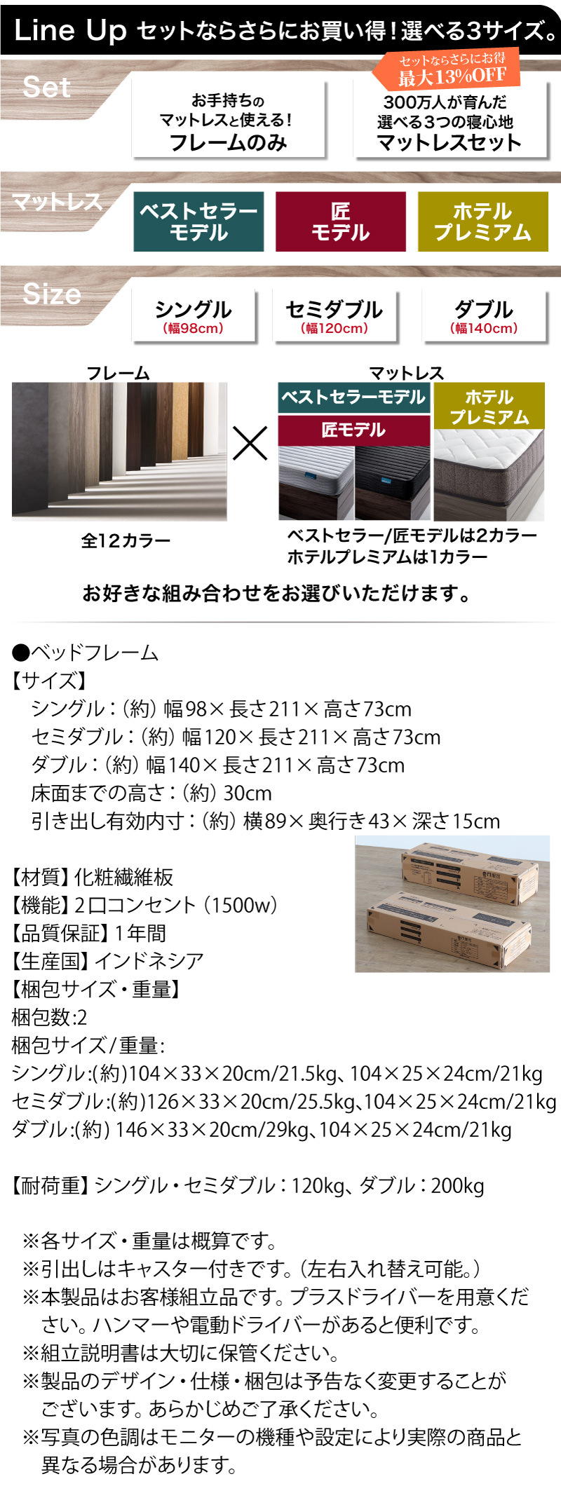 ベッドフレームのみ (現在表示中)匠モデルマットレス付ホテルプレミアムマットレス付ベストセラーモデルマットレス付シングル (現在表示中)セミダブルダブルお客様組立 (現在表示中)組立設置サービス付き[送料]