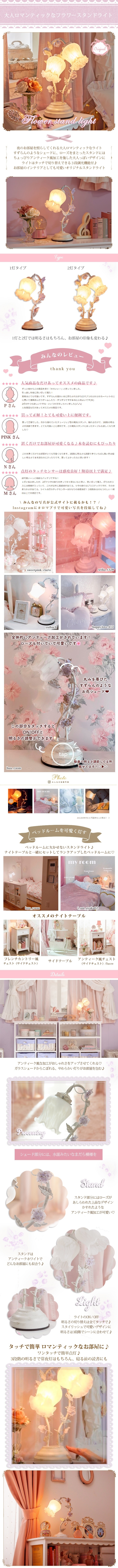 | すずらんのような丸みを帯びたシェードと、ローズをまとったスタンドが、大人ロマンティックなスタンドライト。まだら模様のガラスシェードからこぼれる灯りや、かすれ加工を施したスタンド部が、お部屋をアンティークな雰囲気に演出します。タッチ式の3段調光機能付。シェードと電球を取り付けるだけですぐにお使いいただけます。 |