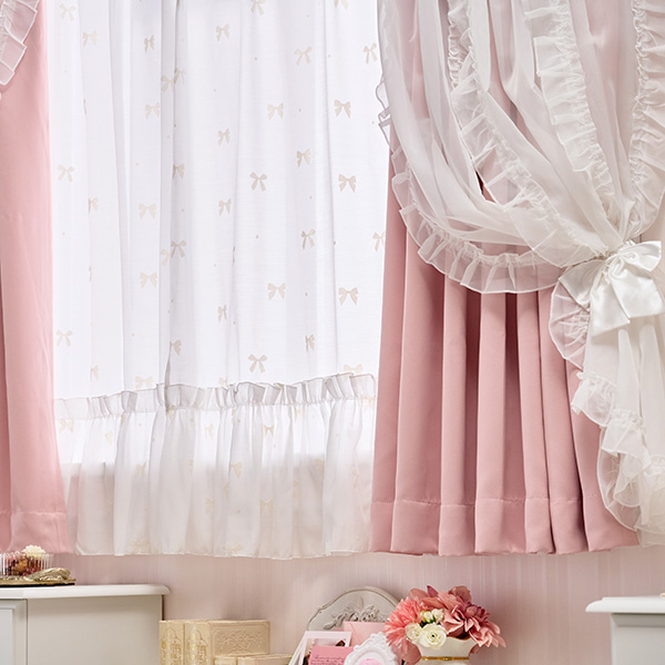 | リボンとドットのモチーフをあしらった裾フリルのレースカーテン。 白地にアイボリーの模様部分はベルベッド(ビロード)のようなふわふわとした立体感のあるフロッキー加工で仕上げました。 ボイル生地はしわになりにくく、生地は硬めながら、ふわっと軽やかでさらっとした肌触りが特徴です。シアーカーテンとも呼ばれる程よい透け感が美しく、幅広のフリルが優雅な雰囲気を演出します。 カーテンの上に重ねて、柄を際立たせたコーディネートもオススメです。 ※こちらは100×133cmのみのページです。 |