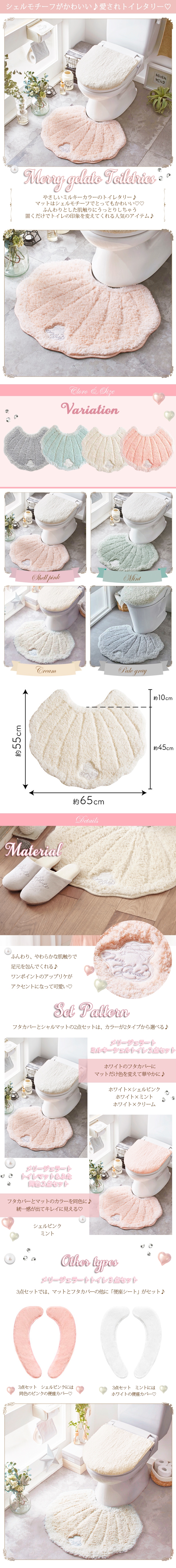| ミルキーなカラーとふんわりした肌ざわりが魅力の「メリージェラート」シリーズのトイレマットセット。 ホワイトのフタカバーとシェルモチーフのマットの2点セット。 フタカバーは吸着シートにより、U型、O型、洗浄・暖房タイプ、どの型にも対応しています。(※一部装着できないものがあります) マットは、シェルピンク、ミント、クリーム、ペールグレーの4色からお好きなカラーをチョイス! |