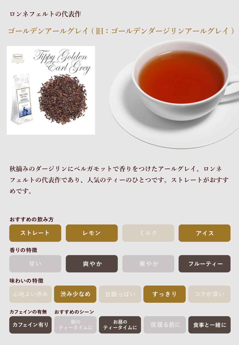 最高級の秋摘みのダージリンにベルガモットの香りをブレンドしたロンネフェルトの代表的なティーのひとつ。