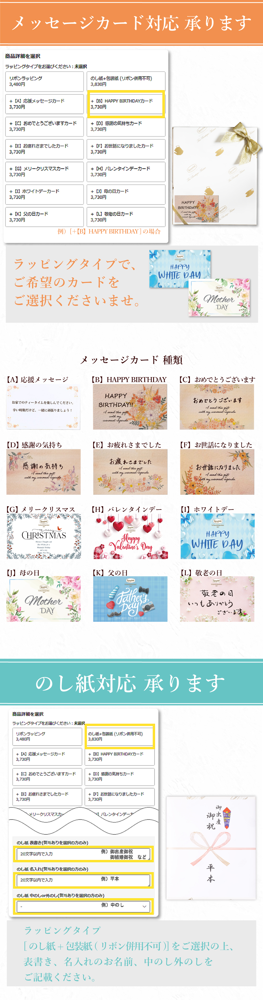 のし紙包装にも対応しておりますので、御祝・内祝・季節の贈り物などにもご利用いただけます。