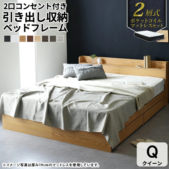 マットレスセット エミー 収納ベッド アンサンブルポケットコイル クイーン ベッド マットレス付き ブラウン ナチュラルホワイト ブラック