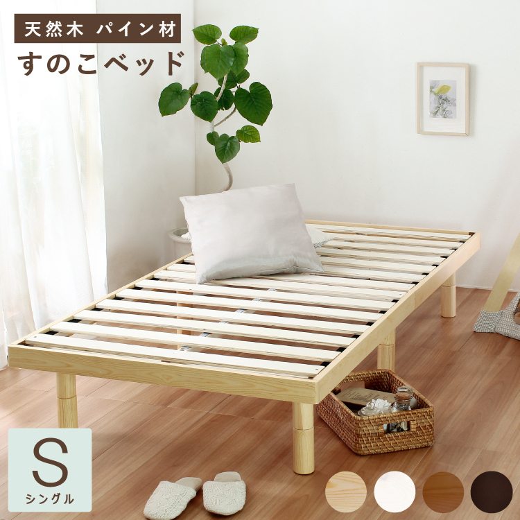 ベッド ベッドフレーム ベット シングル シングルベッド S シングルサイズ Sサイズ パイン材 天然木 シンプル ナチュラル 木目 すのこ スノコ すのこベッド スノコベッド 通気性 衛生的 脚付き 脚付きベッド 高さ調整 高さ調節 3段階 ローベッド ベッド下 収納スペース 脚部取り外し 面取り 折り畳みすのこ ホワイト ブラウン ダークブラウン ライトブラウン 無垢 オールシーズン おしゃれ 人気 キッズ 子供 子供部屋