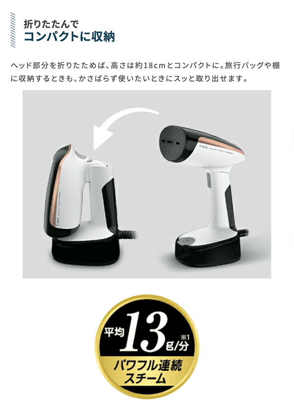 さらにスチームヘッド部分が折りたたみできて、コンパクトで収納に困らない衣類スチーマー。